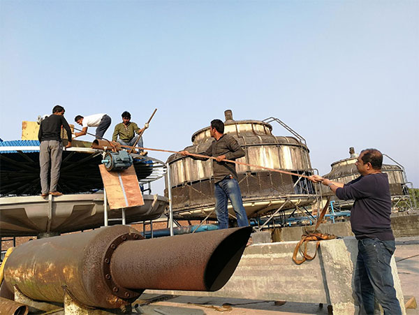 冷却塔的处理水能力450T/H,进水温度37℃,出水温度32℃,圆式玻璃钢冷却塔