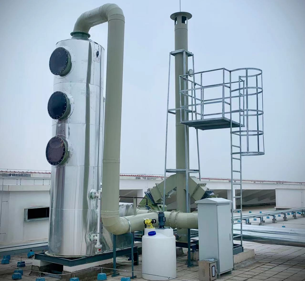 公司内有一检测实验室,产生硫化氢、盐酸等酸性气体,这些气体需要经过治理达标排放,系统采用玻璃钢碱洗塔通过酸碱中和原理玻璃钢风机一用一备工艺治理。