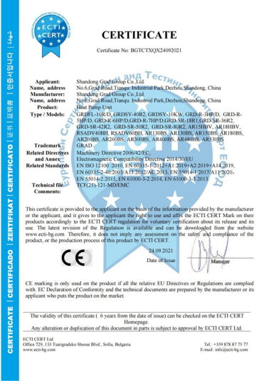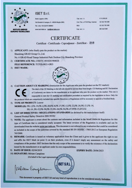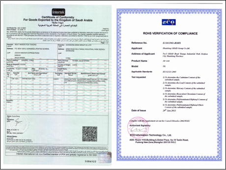 格瑞德集团具有独立的货物进出口资质,可自主报关和报检。具有对外承包工程资质证书,并顺利获得了中央空调末端及复合材料产品的AHRI、CE、SASO、ROHS等资质认证。