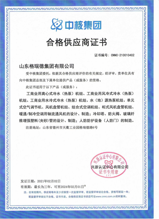 格瑞德冷却塔公司拥有国家级冷却塔性能检测基地,并且入围中核集团合格供应商。玻璃钢横流冷却塔(GAT系列)产品均通过了国家级权威检测机构的检测,其中冷却塔的热力性能、漂水率、耗电比、噪音等关键技术指标处于国际先进水平,取得了美国CTI认证、中国节水产品认证、中国节能产品认证、中国冷协CCTI认证。