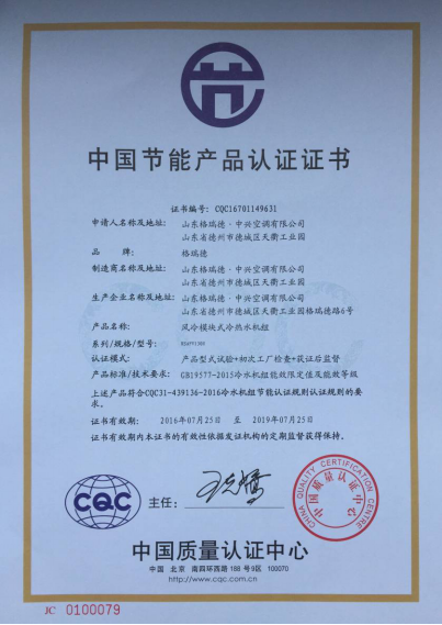 grad山东格瑞德集团风冷模块式冷热水机组荣获中国节能产品认证证书