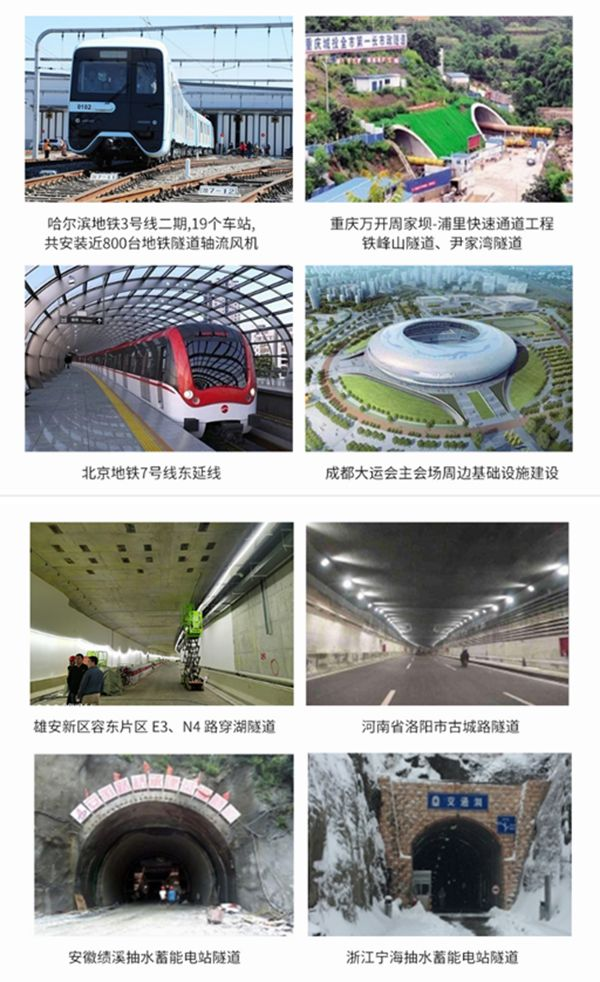 地铁风机分单向DTF(R)和双向DTFR系列两种形式。风机叶轮采用机翼型压铸铝叶轮,空气动力性能好,可改变叶片数量和叶片角度,满足不同需求,能效达国家1级能效;配套高效耐高温高防护等级优质电机,也可根据客户要求配备国际知名品牌电机;可广泛应用于地铁、公路、铁路、矿山、电力、水利大坝、建筑工程、车站、石化冶金、机场、防空及其他工业领域等场所。