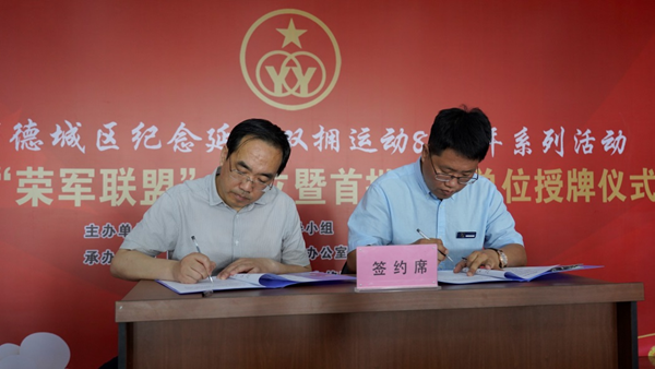 5月31日,为纪念延安双拥运动80周年,德城区双拥工作领导小组办公室、区退役军人事务局、天衢街道办事处、山东格瑞德集团有限公司联合举办了德城区“荣军联盟”成立暨首批成员单位授牌仪式,德城区政府副区长郑虎同志主持,德州市退役军人局副局长王国琦同志、德城区人武部上校部长赵峰同志、德城区退役军人局局长吕良缘同志等出席,格瑞德集团执行总裁管志广受邀参加签约授牌仪式。