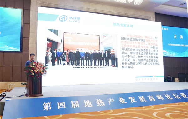 地热及热泵产业研究中心副主任王涛以“格瑞德全生命周期地热产业链”为主题进行现场宣讲,详细介绍了格瑞德全生命周期地热产业链打造情况以及集团打造的经典地热案例,得到了大家对格瑞德集团技术水平和地热产业贡献的认可。