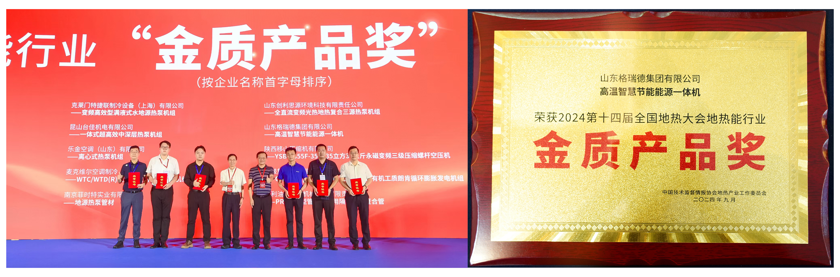 值得一提的是,集团在本次大会上凭借“高温智慧节能能源一体机”获得地热能行业金质产品奖,“中共临邑县委党校地源热泵项目”获得地热能行业优质工程奖。两个奖项的获得,标志着集团不仅在地热产品制造方面成就卓越,在系统工程承揽方面也具备超强实力,再次彰显格瑞德集团在地热行业的重要地位。