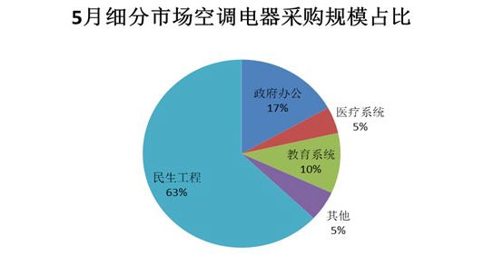 5月,政府机关空调采购金额达3.26亿元,占比17%。为了凸显规模效应,空调批采已成为越来越多政府机关民用空调采购首选。批采通过汇总采购人实际需求从而形成规模效应,让竞争更加充分,既体现公平公正,也最大限度地节约财政资金。5月,空调批采千万元大项目主要聚集在广东,吸引主流空调厂家积极参与。此外,随着酷热天气临近,不少采购单位把空调维修保养摆上重要议事日程。以北京为例,5月中央空调维修更新项目近十个,其中北京市公安局本级行政四个项目密集开标,包括北京市公安局直属单位2017年中央空调维修更新项目等。