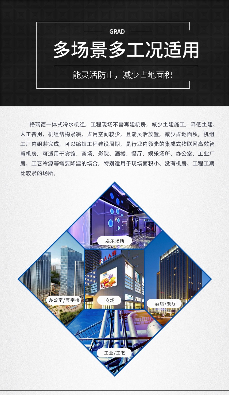 格瑞德致力于让人工环境更美好,通过打造空调工程、通风人防、复合材料、环保工程领域的全过程解决方案来满足客户需求,格瑞德构建了包括品牌规划、系统设计、技术开发、产品制造、整体施工、维护服务、检测认证、人才交流、产业集群的全生命周期产业链和产业生态。