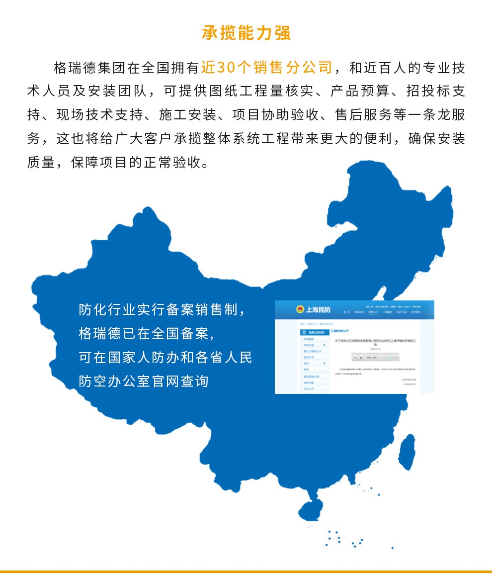 集团在北京、天津、沈阳、西安、武汉、昆明、兰州等全国各地建立30多个销售服务公司,依托遍及大江南北的30多个销售服务公司,格瑞德建立了一套完善的售后服务体系,建立起以市场为导向的多层面、立体化的营销网络和售后服务网络,使用户所购产品拥有最值得信赖的保障。
