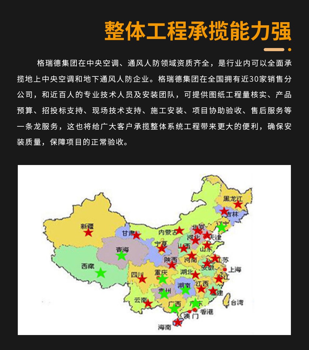 格瑞德致力于让人工环境更美好,通过打造空调工程、通风人防、复合材料、环保工程领域的全过程解决方案来满足客户需求,格瑞德构建了包括品牌规划、系统设计、技术开发、产品制造、整体施工、维护服务、检测认证、人才交流、产业集群的全生命周期产业链和产业生态。